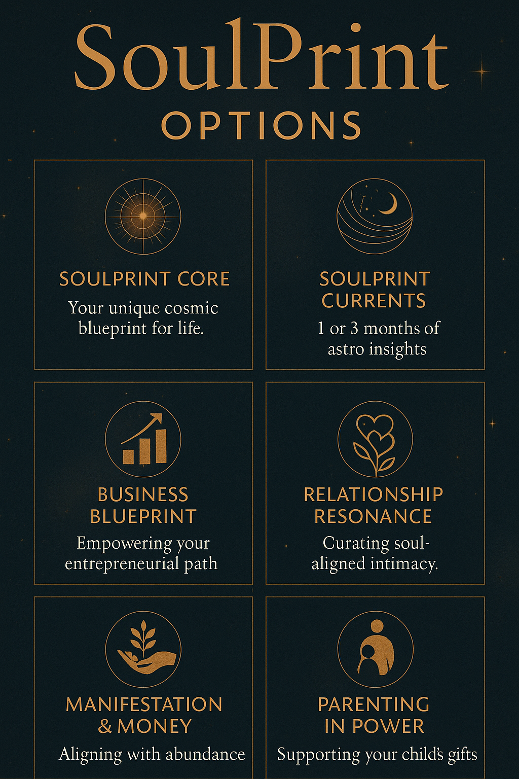 Your SoulPrint is the energetic architecture encoded into your being at the moment of your first breath—woven from astrology, Human Design, and your body’s sacred knowing.